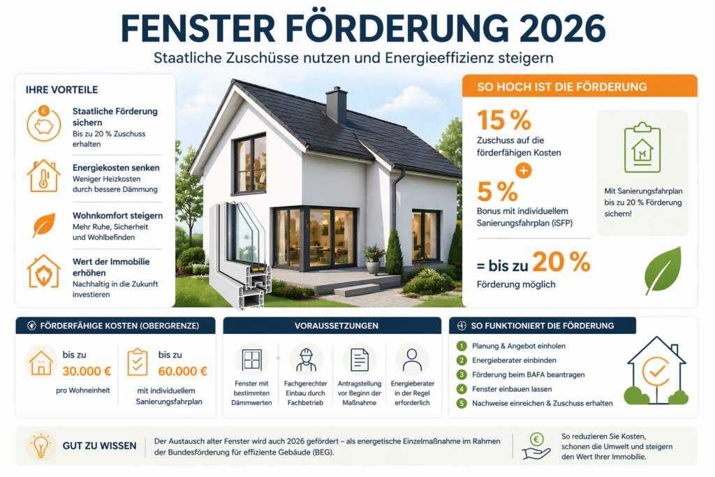Die wichtigsten Punkte zur Fenster Förderung 2026 sehen Sie hier kompakt zusammengefasst.