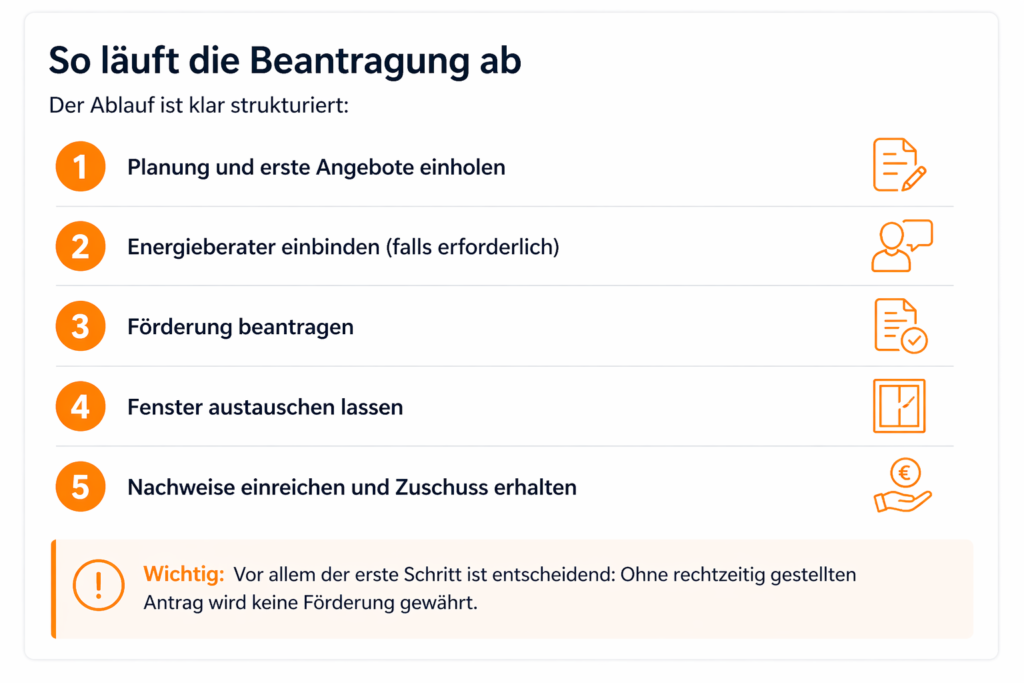 📌 Gerade der Zeitpunkt des Antrags wird häufig unterschätzt. Wird der Auftrag zu früh vergeben, entfällt die Förderung.